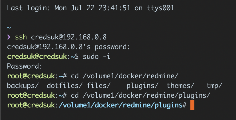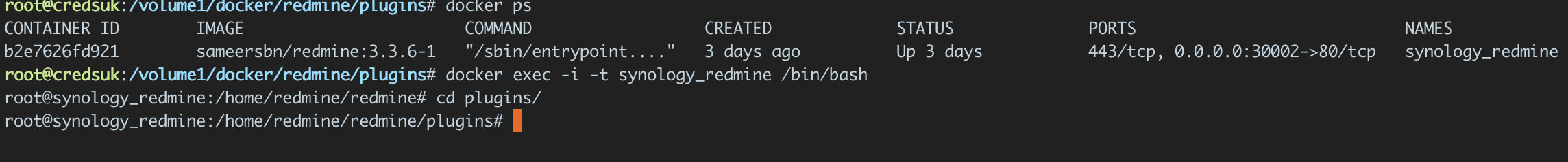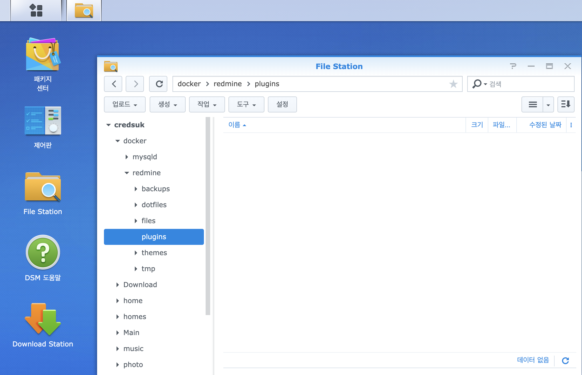 파일 스테이션 -> 도커 -> 레드마인 -> 플러그인 폴더에 압푹을 해제한 파일을 넣어두고